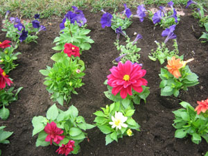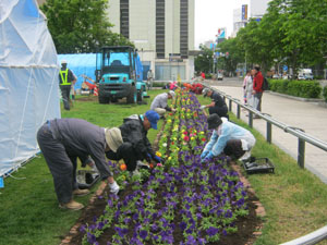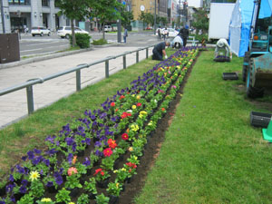 大通公園西3丁目の東西ボーダー花壇に、約2400株のペチュニアなどの夏苗を