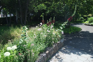 大きな円形の花壇には、植物たちが元気よく育っています。