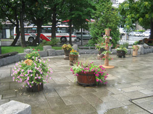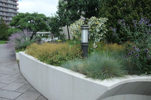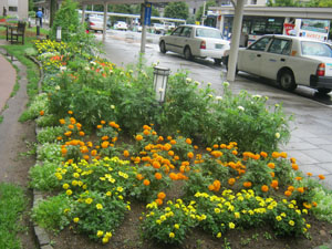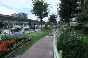歩行者通路と一体となった花壇はきれいに管理されて、
