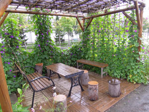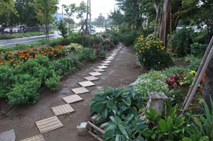 花壇には、点字ブロックを敷いた、車いすでも通ることができる通路があります。