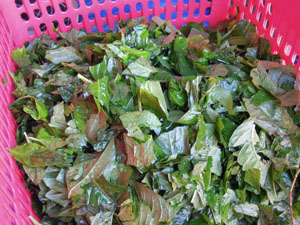 生葉染めには、花壇で育てた藍の葉を使いました。