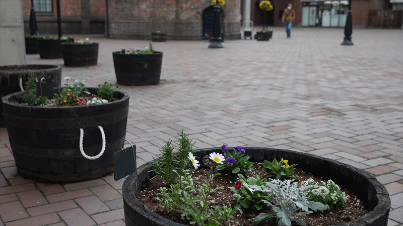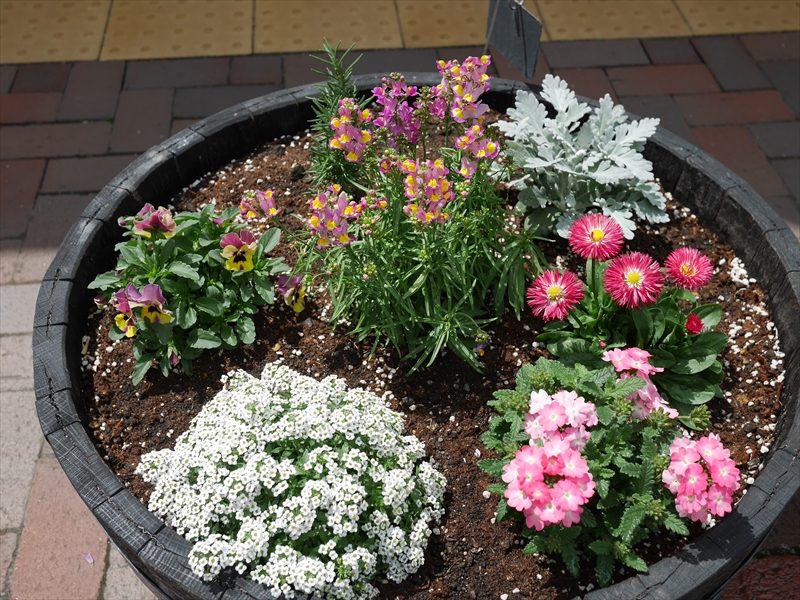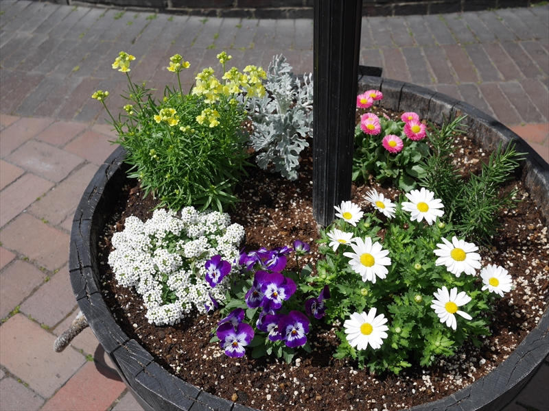 4月に春の花植えを行ってから1カ月。サッポロファクトリーの煙突広場に設置された樽型コンテナ15基の株は、1回り大きく生長していました。