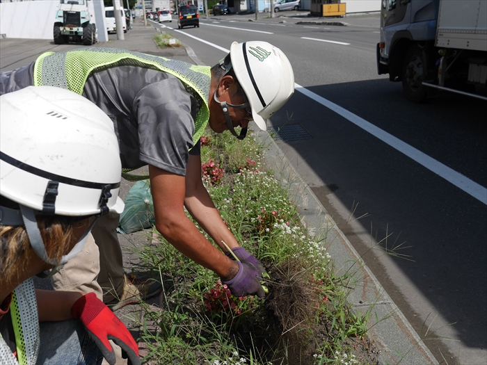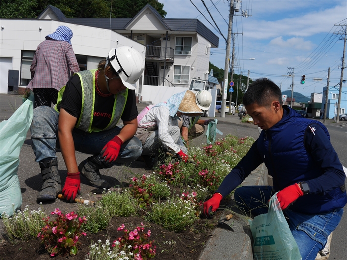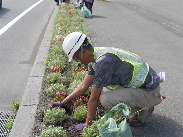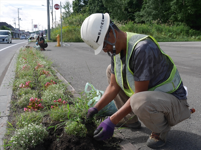 失礼ながら建設現場の方と花壇とはミスマッチかと感じましたが、お聞きするとほとんどの方が普段から自宅庭や町内のます花壇の除草をしているのだそうです。姿勢よくかがんで草を取る姿が様になっています。みなさん素敵です!