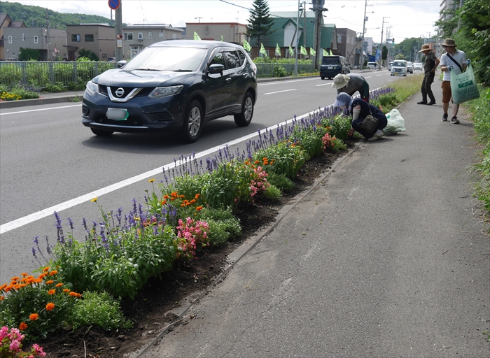 この日は会員が15名、会員外の方が10名参加しました。会員外10名のうち、フラワーロードのある区間で道路工事を行っている南区のエイト建設から7名の参加がありました。市内各地で道路工事を行っているそうですが、「地域貢献をしたい」と仕事の休日にボランティアとして参加されました。