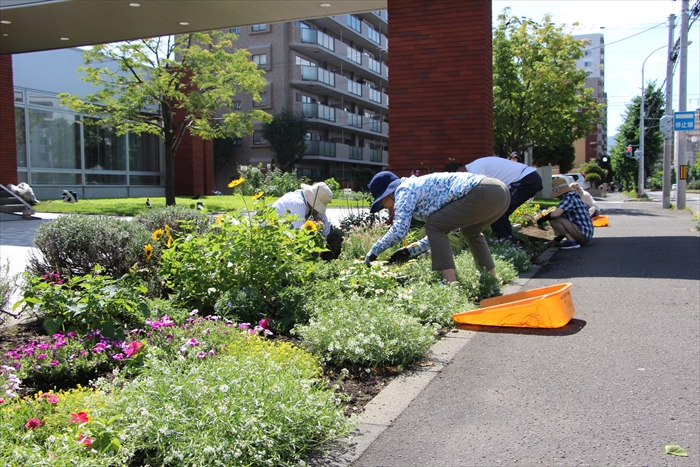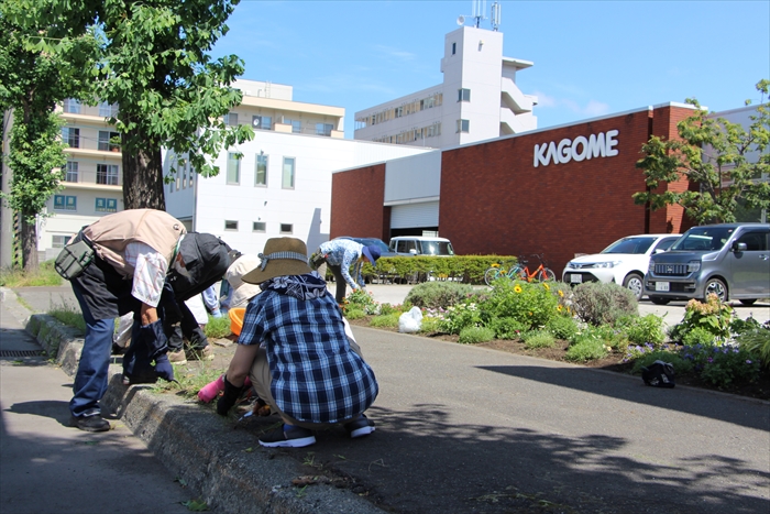 登録団体「カルガモみどりの会」は、2022年春からカゴメ北海道支店前の花壇管理の支援を行っています。8月10日の活動を取材しました。
