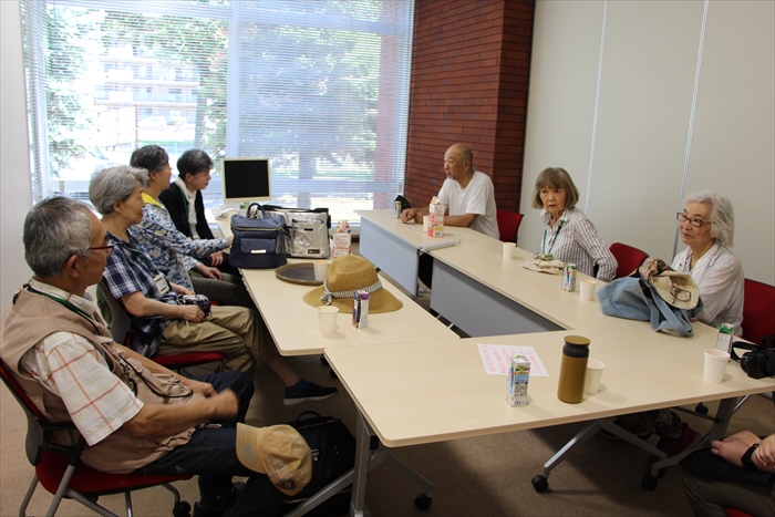 炎天下で作業をした後は、涼しい部屋で休憩タイム。今後の活動の連絡や自宅で育てている植物の生育相談や料理法など、楽しい話に花が咲きました。「会の活動に参加してから、知りたかったことをみなさんに教えていただいてとても助かっています」と昨年から参加しているメンバーさん。
