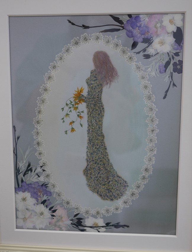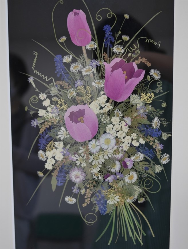 会場には畑田さんが押し花で作った素晴らしい作品が並びました。ため息が漏れるような美しいドレスやブーケ、ち密な絵画のような作品もあれば、茶目っ気たっぷりなかわいらしい作品もあり、バラエティに富んでいて会場にいらっしゃったみなさんの心をつかみました。