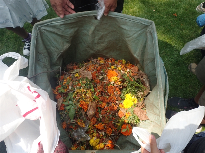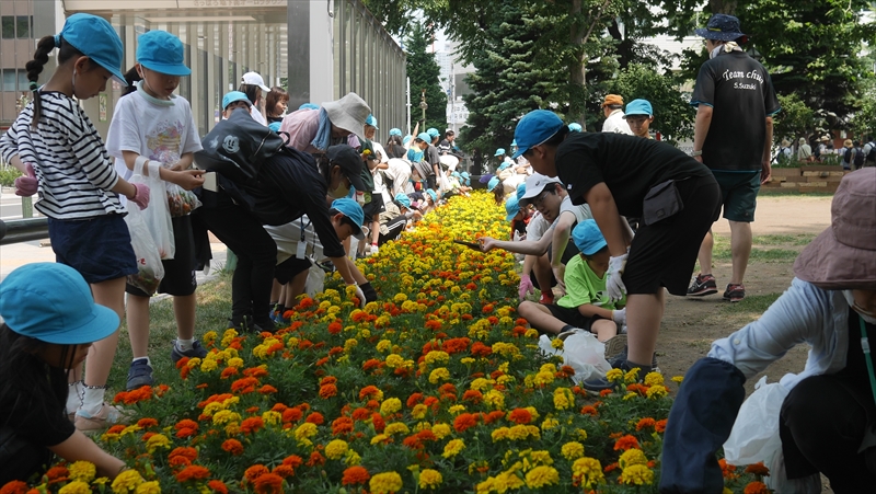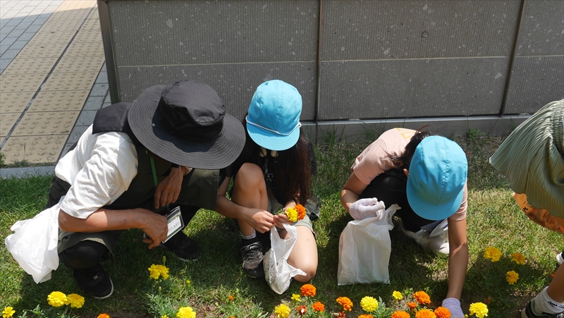 さっぽろタウンガーデナーさんとシーズネットさんは、どの花をつめばよいのか、どうやって花がらをつむのかを一緒につみながら教えました。マリーゴールドの花がらを手でプチップチッと切ってゆくと、見る間にきれいになってゆきましたね。