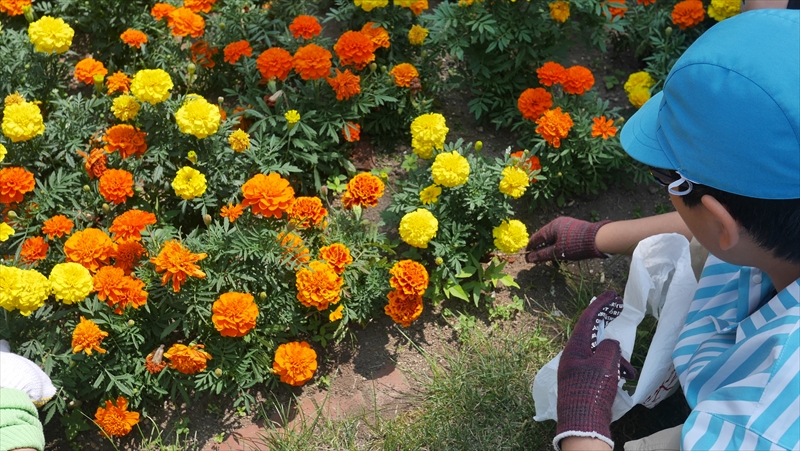 マリーゴールドの花がらつみでは、よく花壇の花を見て枯れた花を探します。