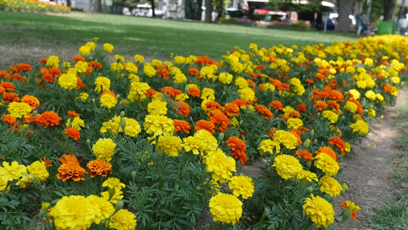 黄色とオレンジの明るい花がとても良く目立つためか、観光で大通公園に来られた方が、時々足を止めて花と一緒に写真を撮る姿が見られました。