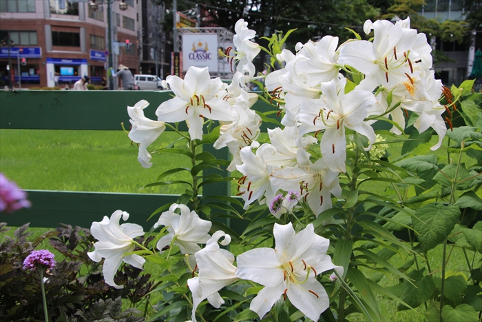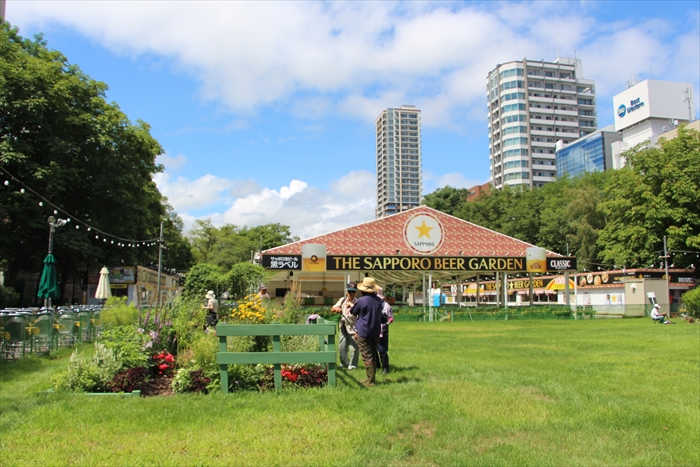 7月18日から8月13日は大通公園の「さっぽろ夏祭り」開催期間中で、大通公園西8丁目はビアガーデン会場になっています。リラの会の花壇は大きなテントや飲食用のテーブル席に囲まれ、とても賑やかな中でのメンテナンスとなりました。