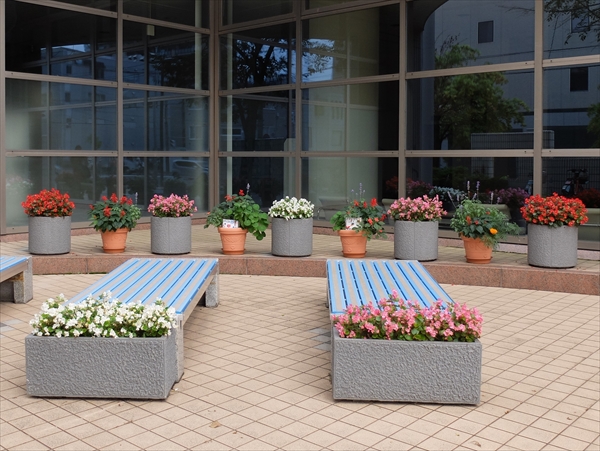 まちづくり体験実習「マイタウン・マイフラワープラン」まちなかでフラワープランターの花が咲いています