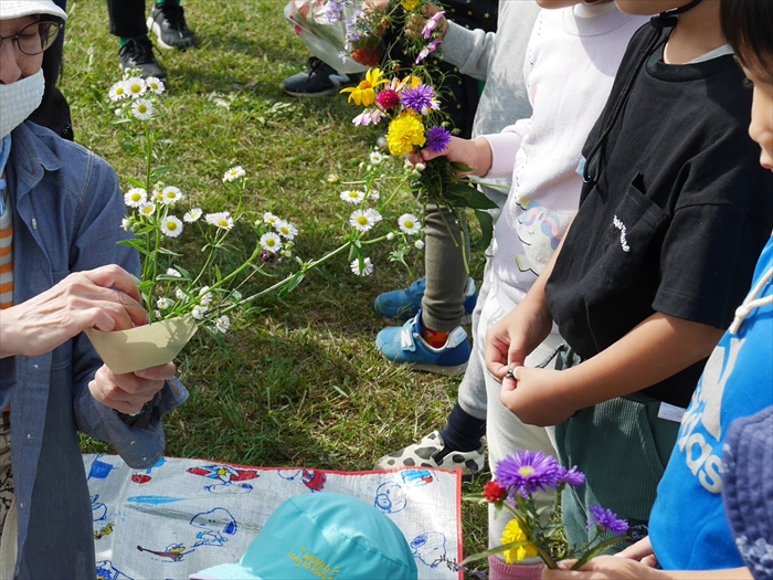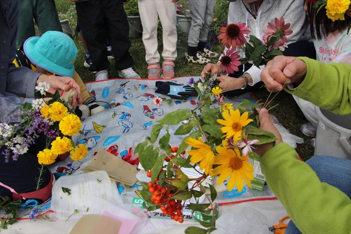 会のメンバーが予め摘んで用意したたくさんの花から、好みの花を数本選んで花束つくりをしました。