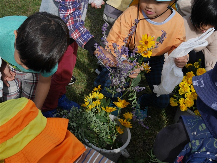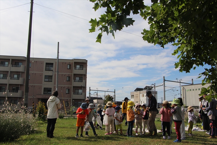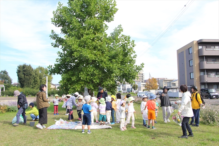 10月9日、花と緑のボランティア団体「百合が原花壇を造り隊」が、活動場所のJR百合が原駅前のロータリーで、社会福祉法人 風の子会 風の子保育園の園児36人と交流イベントを行いました。