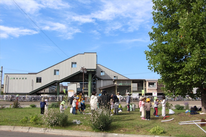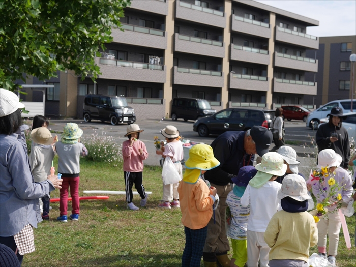 百合が原駅のすぐ近くにある風の子保育園の園児たちは、毎朝百合が原駅の前をお散歩で通ります。花壇のメンテナンスを行っている花壇を造り隊のメンバーとは、いつも顔を合わせ、声をかけて手を振ったりする間柄。会の招待を受けて、園児たちは笑顔で花壇に集まってきました。