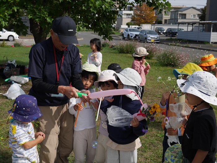 花束つくりの後、みんなが大好きなシャボン玉と風船遊びも行いました。