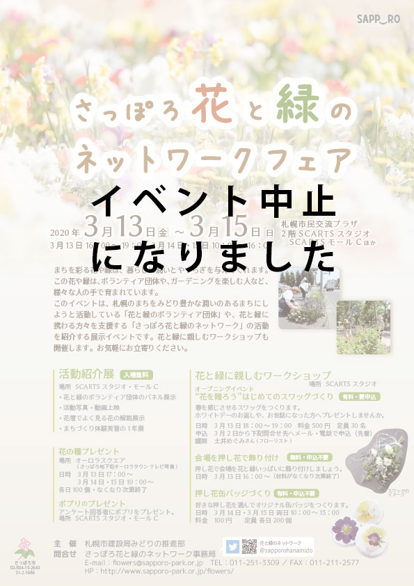 新着情報 事務局より 主催事業・イベント さっぽろ花と緑のネットワークフェア中止のおしらせ 2020年02月22日 新型コロナウイルス感染症の感染拡大防止のため、不特定多数の方が集まる札幌市主催イベントを中止する方針となりました。それに伴い、さっぽろ花と緑のネットワークフェアも中止が決まりましたのでお知らせいたします。楽しみにされていた皆様、また、準備にご協力いただいた皆様、申し訳ありません。 Tweet 次へ 一覧へ戻る 前へ カテゴリー 新着情報 ブログ 事務局より ボランティア募集 主催イベント報告 団体活動紹介 ガーデナー紹介 関連行事ご案内 主催事業・イベント 講習会・検定試験