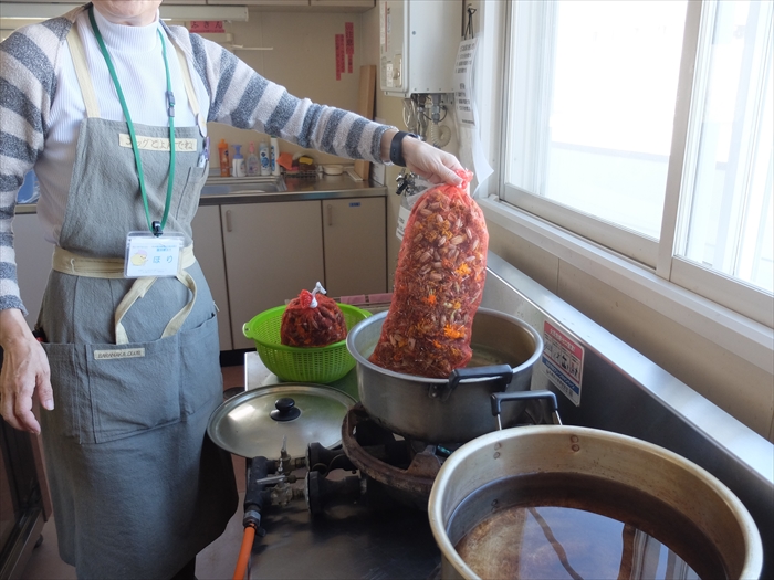 会の方が集めた花がらは、なんと5~6kg。500gずつネットに入れて強火でグラグラ煮立てると、マリーゴールドの香りが部屋中に漂いました。