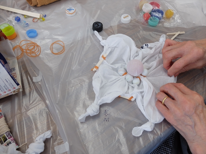 完成した時の模様をイメージされているのか、たくさんのビー玉を縛ってタコのようであったり、はしごのようであったりと多様なしばり方が見られ、この時点から出来上がりが楽しみになってきました。