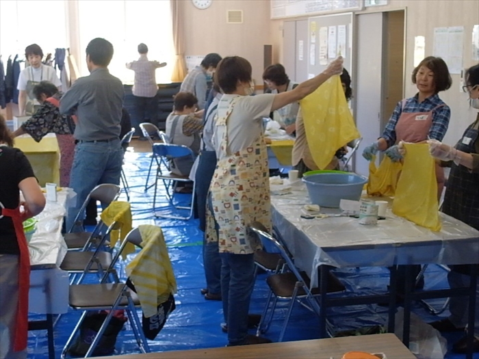 このように綿の素材がきれいに染まるには、下処理が大切だと講師の堀さん。会の事務局の2人で、「うまく染まりますように」と念じながらぐつぐつとバンダナを煮て処理をする時は、魔女のような気分になったのだとか。