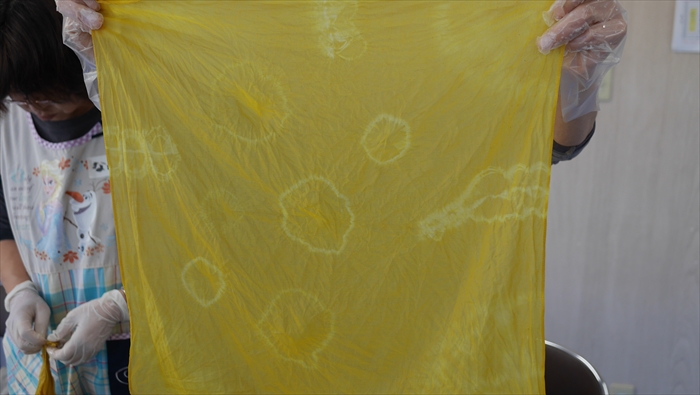 マリーゴールドの染液に15分浸し、軽く絞って定着液に入れ、ゆらゆらゆらしてしみこませました。