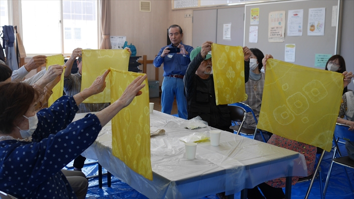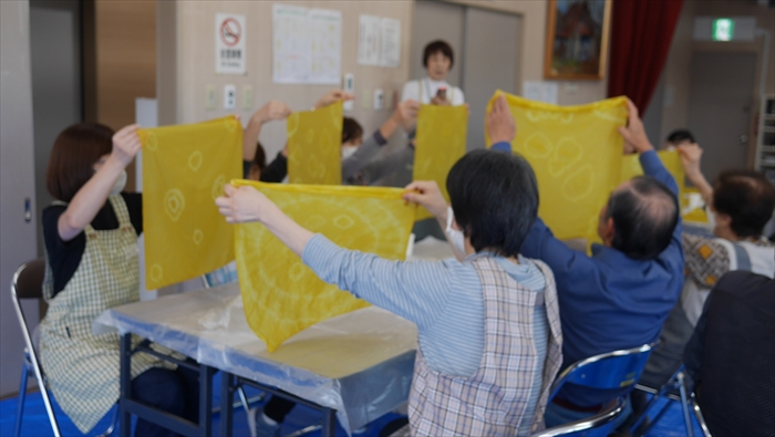 「花壇のマリーゴールドのお手入れでは、花がらつみが大変だったでしょうが、染色をして癒されてください」と会の小林代表。