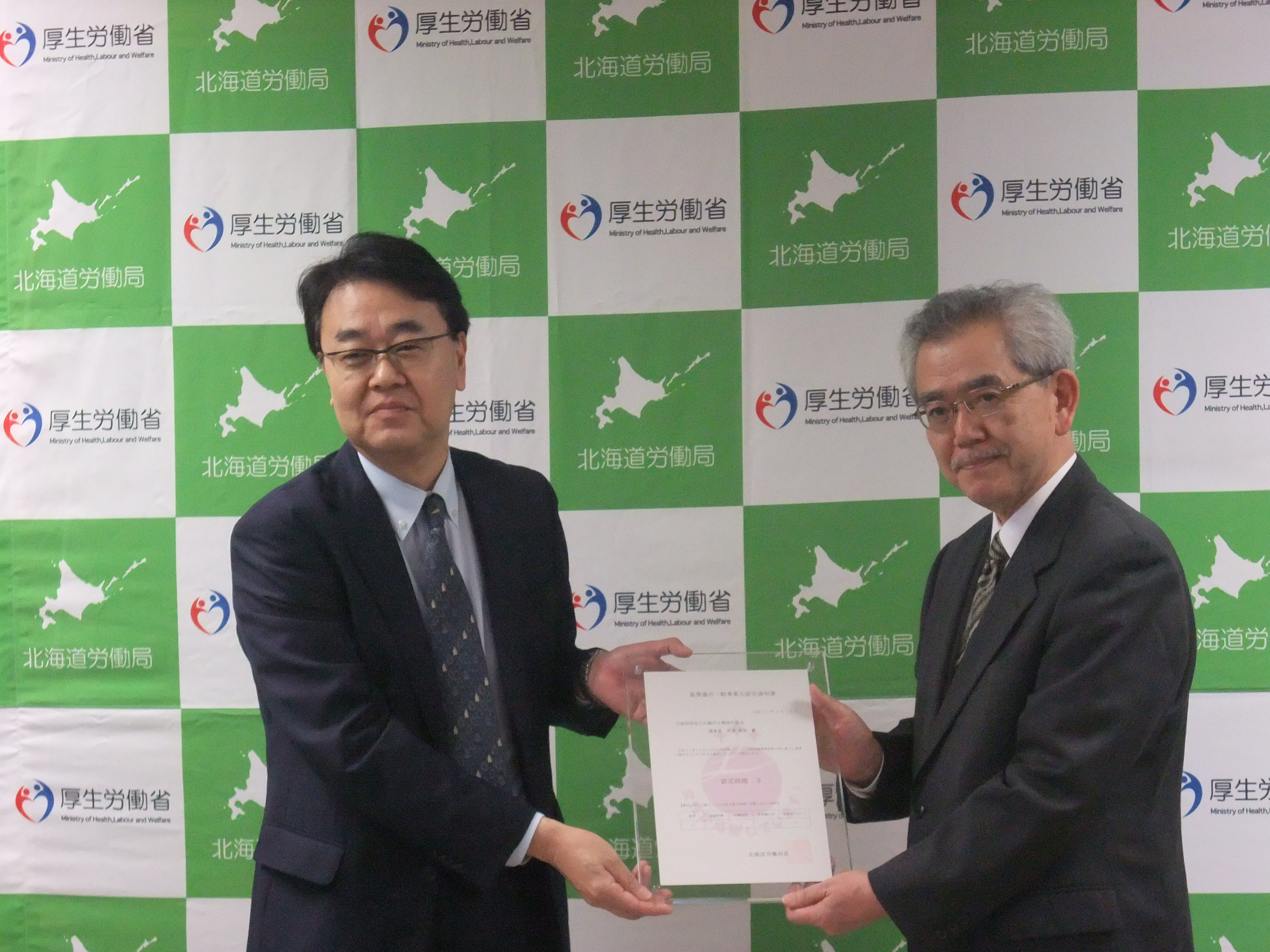北海道労働局長(写真左)からエル星認定3段階目が授与されました(写真右当協会理事長)