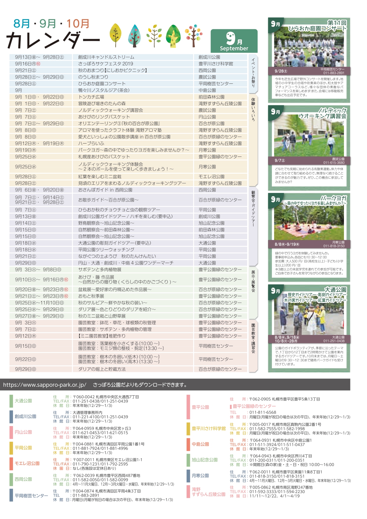 さっぽろ公園だより2019年8~10月号ができました 2019年7月30日 さっぽろ公園だより2019年8~10月号が出来ました! 当協会で管理している各公園・施設などで配布しています。 札幌公園だより2019年8~10月号 表紙 札幌公園だより2019年8~10月号 8月イベント案内 札幌公園だより2019年8~10月号 9月イベント案内 札幌公園だより2019年8~10月号 10月イベント案内