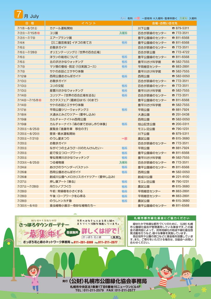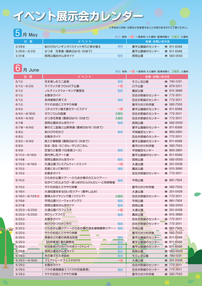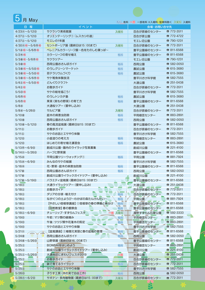 さっぽろ公園だより2019春号ができました 2019年5月13日 さっぽろ公園だより2019春号ができました! 当協会で管理している各公園・施設などで配布しています。 さっぽろ公園だより2019春号 さっぽろ公園だより2019春号イベント案内5月 さっぽろ公園だより2019春号イベント案内5~6月 さっぽろ公園だより2019春号イベント案内7月