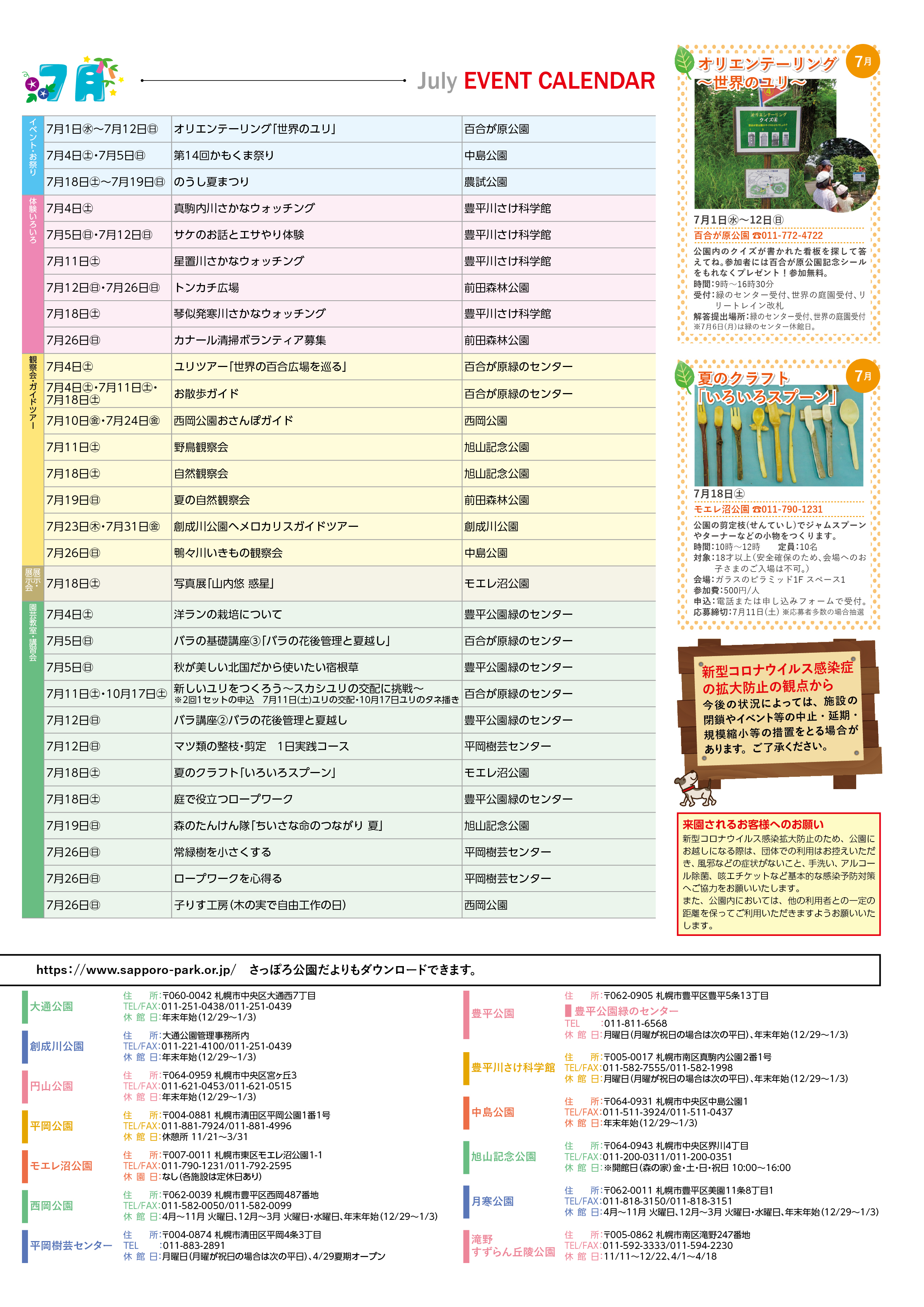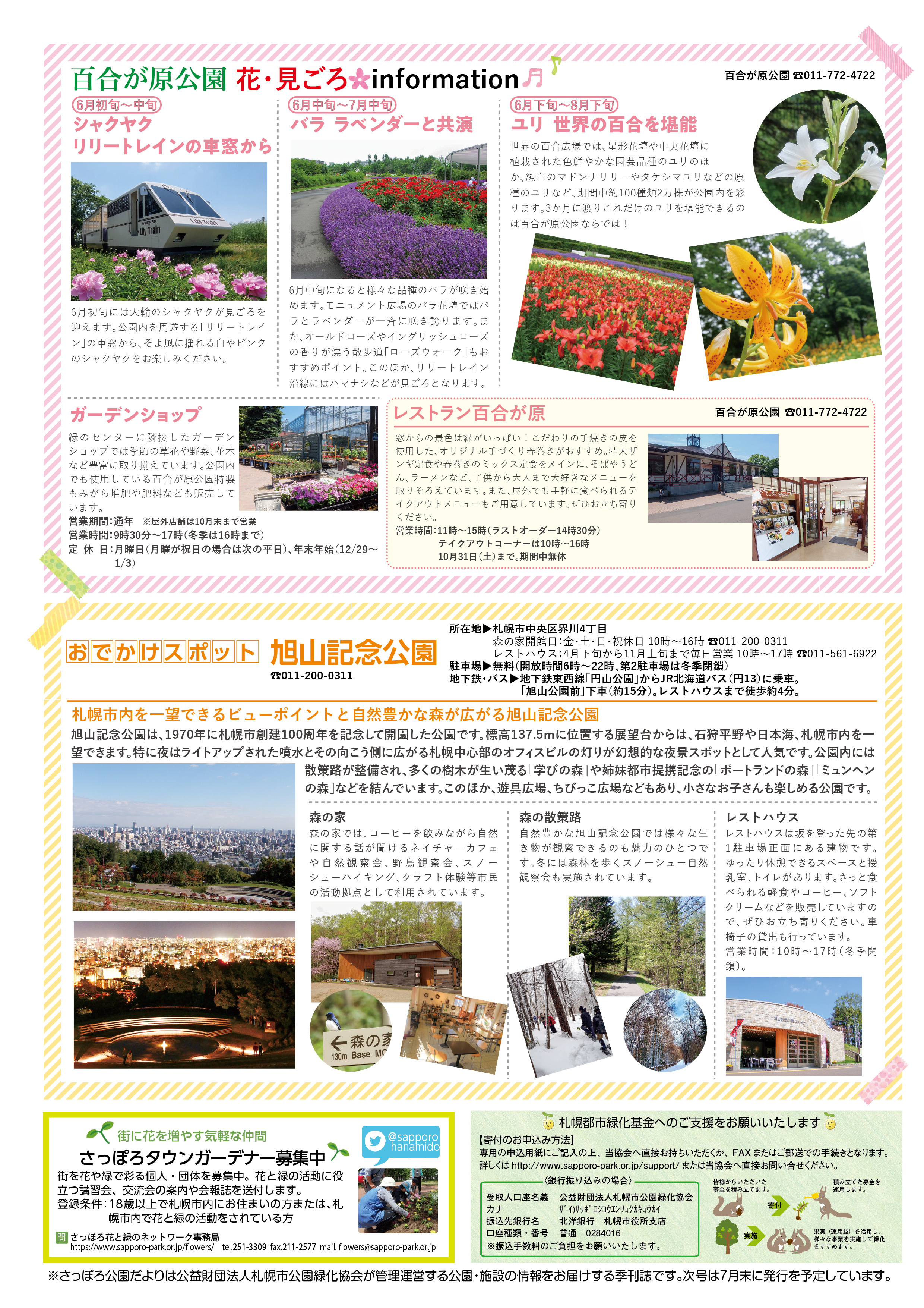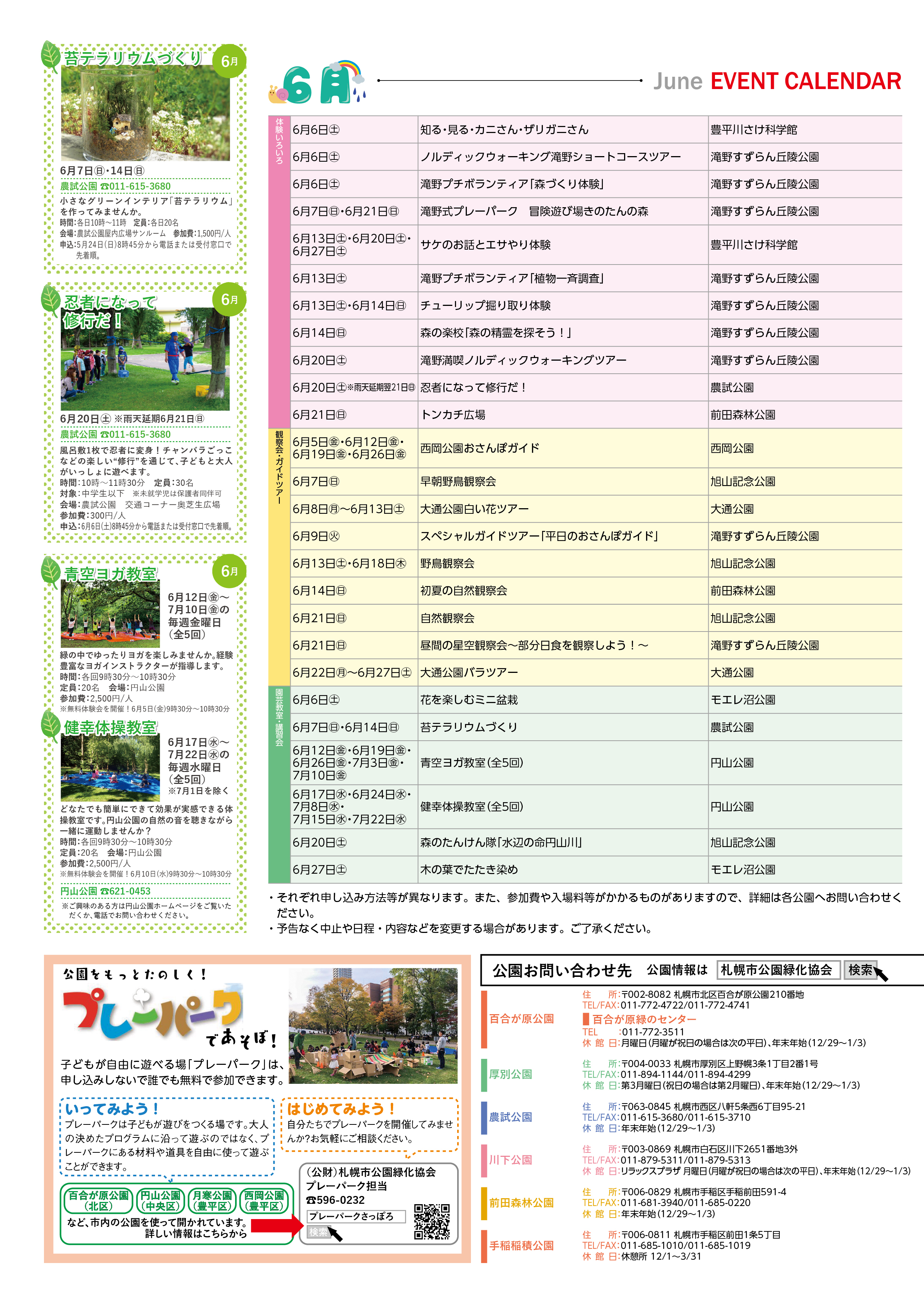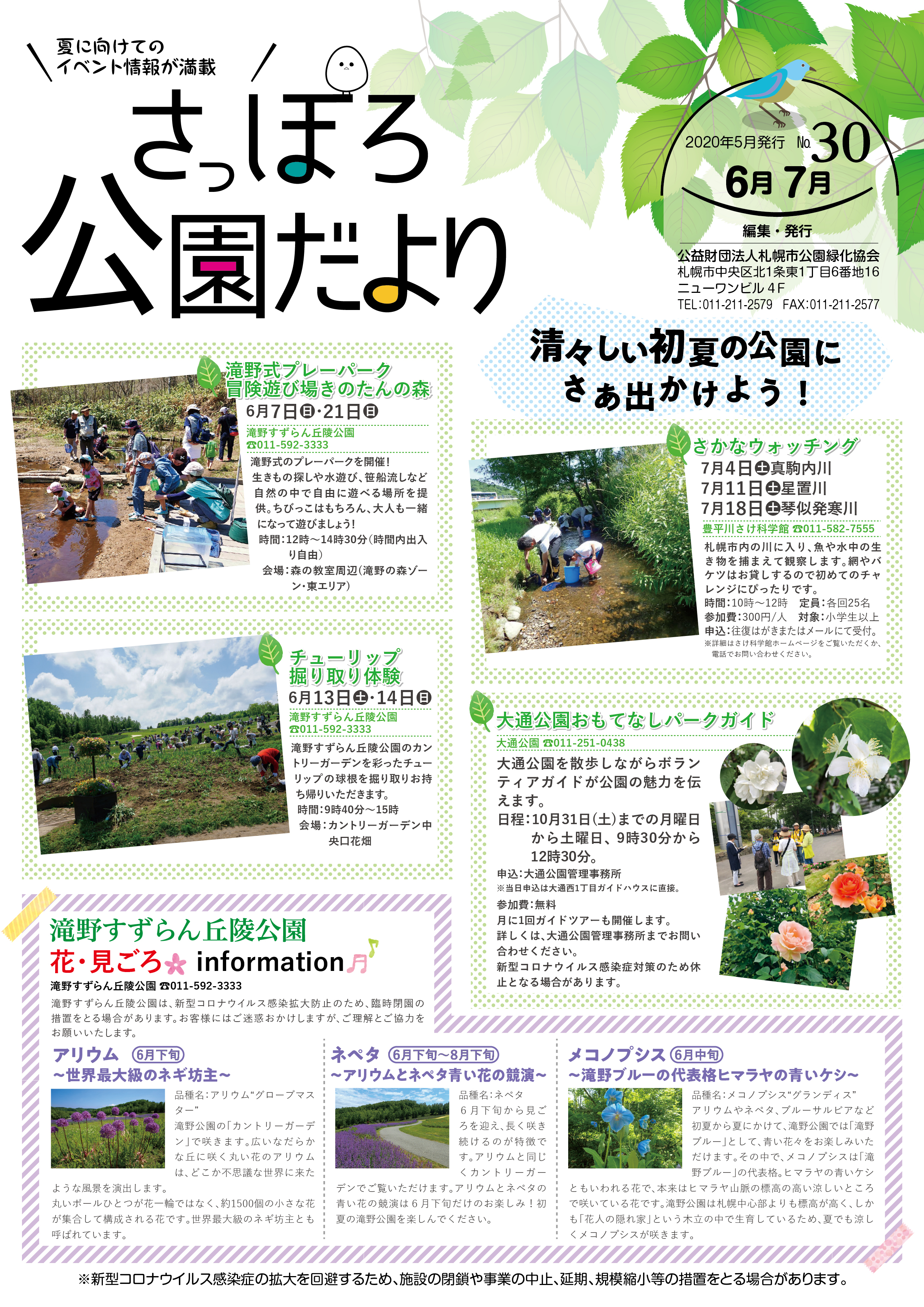さっぽろ公園だより2020年6・7月号ができました 2020年5月25日 さっぽろ公園だより2020年6月・7月号が出来ました! 当協会で管理している各公園・施設などで配布しています。 さっぽろ公園だより2020年6・7月号 表紙 さっぽろ公園だより2020年6・7月号 6月イベントカレンダー さっぽろ公園だより2020年6・7月号 7月イベントカレンダー さっぽろ公園だより2020年6・7月号 花information&おでかけスポット さっぽろ公園だより2020年6月・7月号(PDF/3MB)
