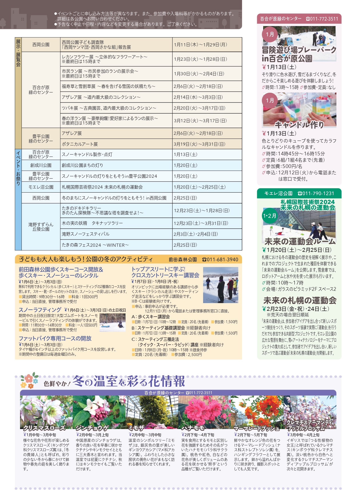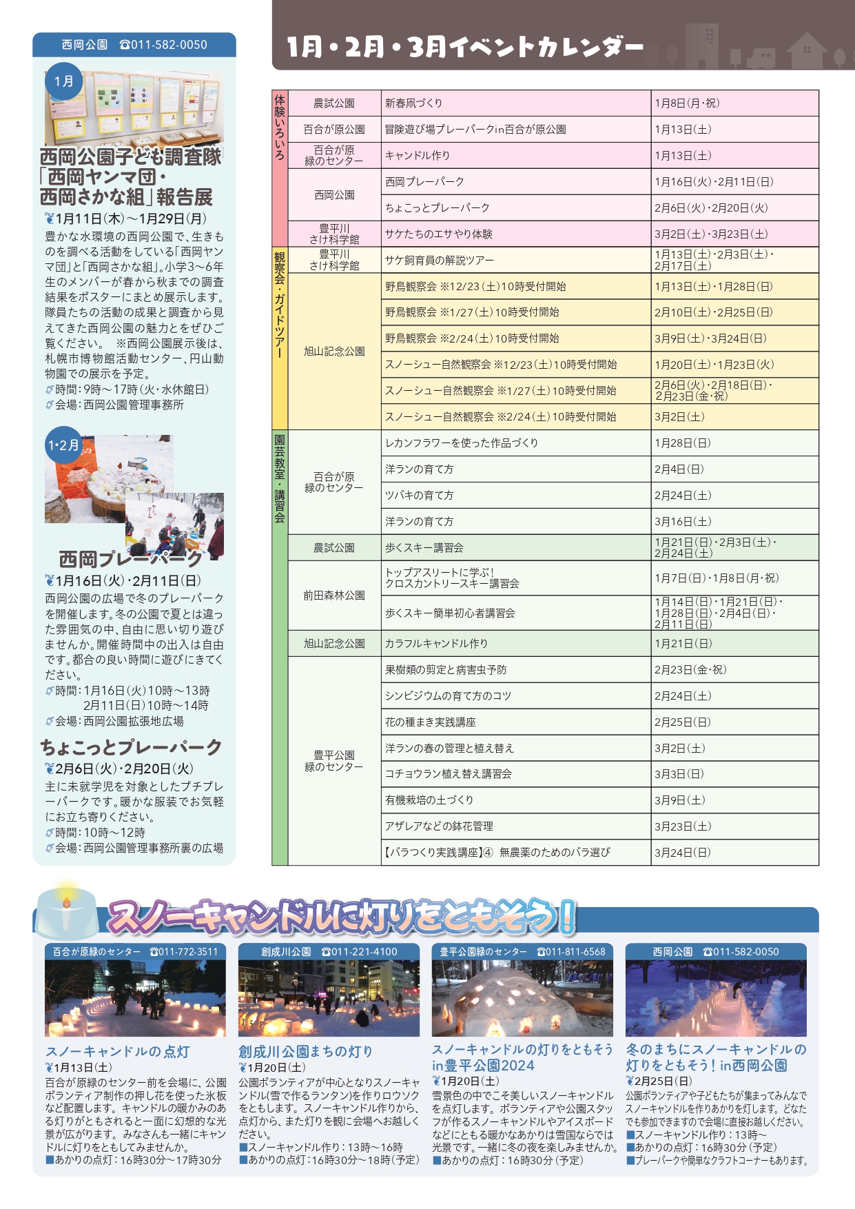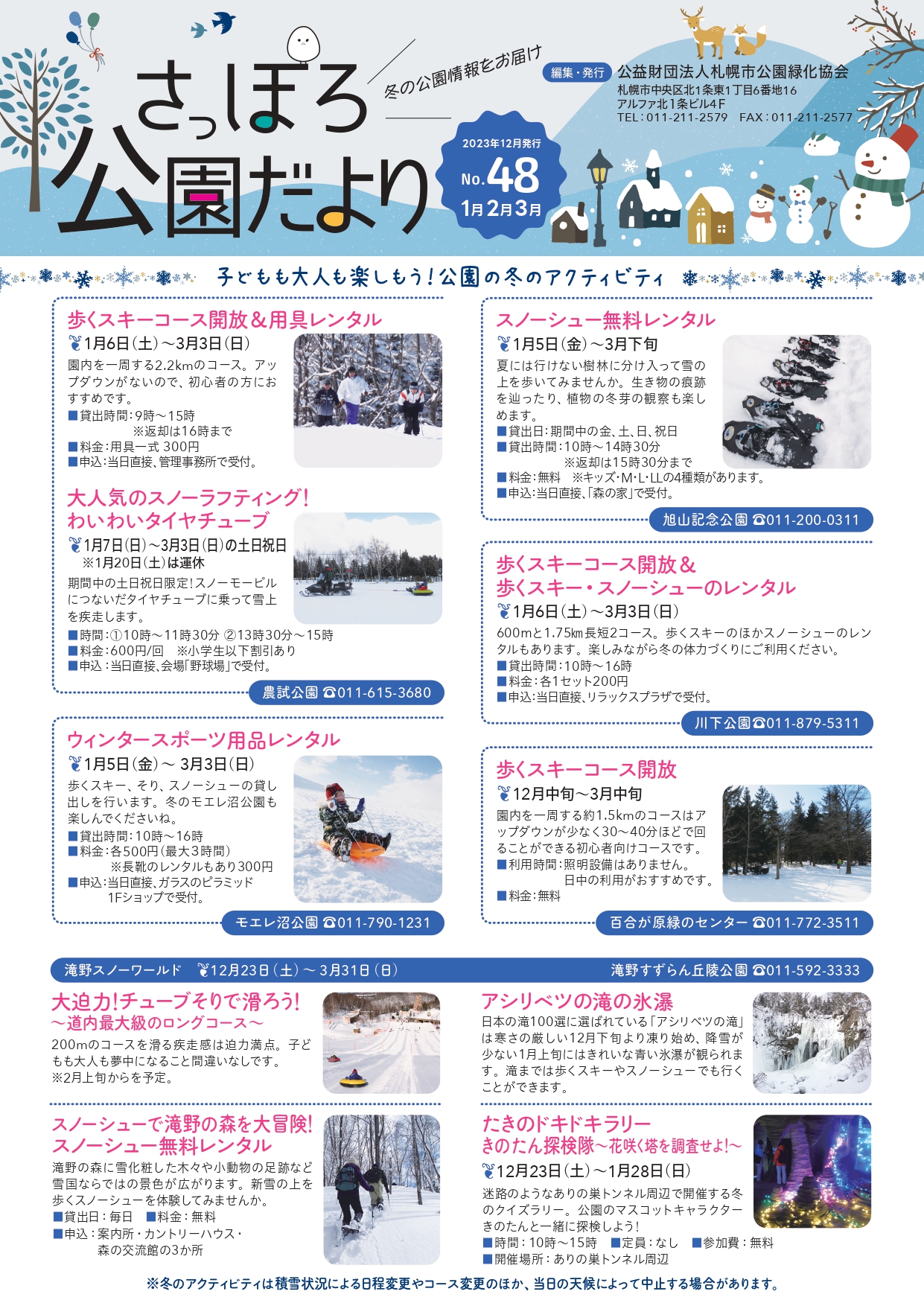 さっぽろ公園だより2024年1月・2月・3月号ができました 2023年12月27日 さっぽろ公園だより2024年1月・2月・3月号ができました! 当協会で管理している各公園・施設などで配布しています。 さっぽろ公園だより2024年1月・2月・3月号_表紙 さっぽろ公園だより2024年1月・2月・3月号_イベントカレンダー1 さっぽろ公園だより2024年1月・2月・3月号_イベントカレンダー2 さっぽろ公園だより2024年1月・2月・3月号_展示会情報等 さっぽろ公園だより2024_1月・2月・3月(PDF/10.3MB)