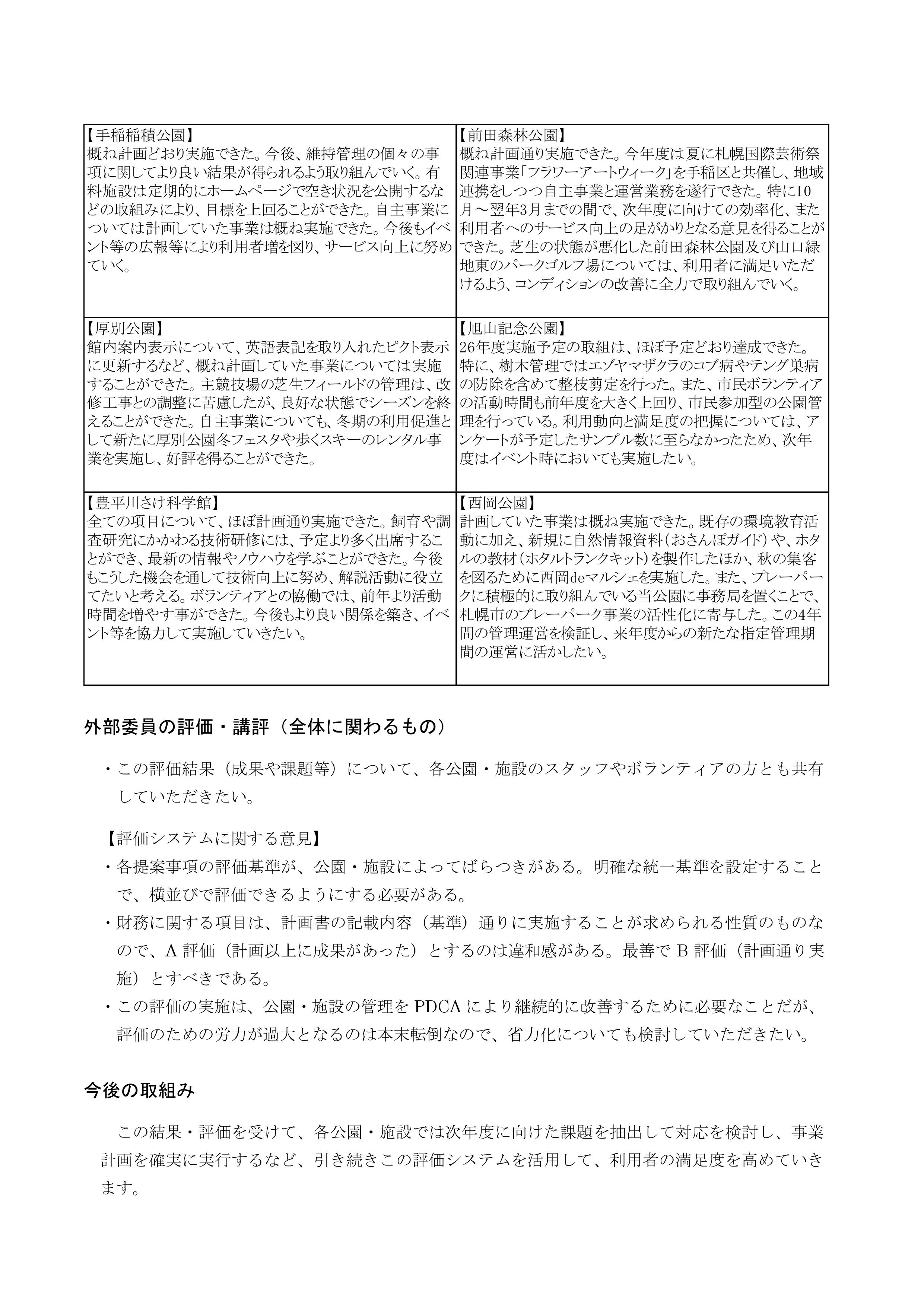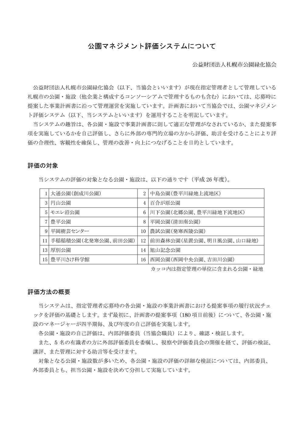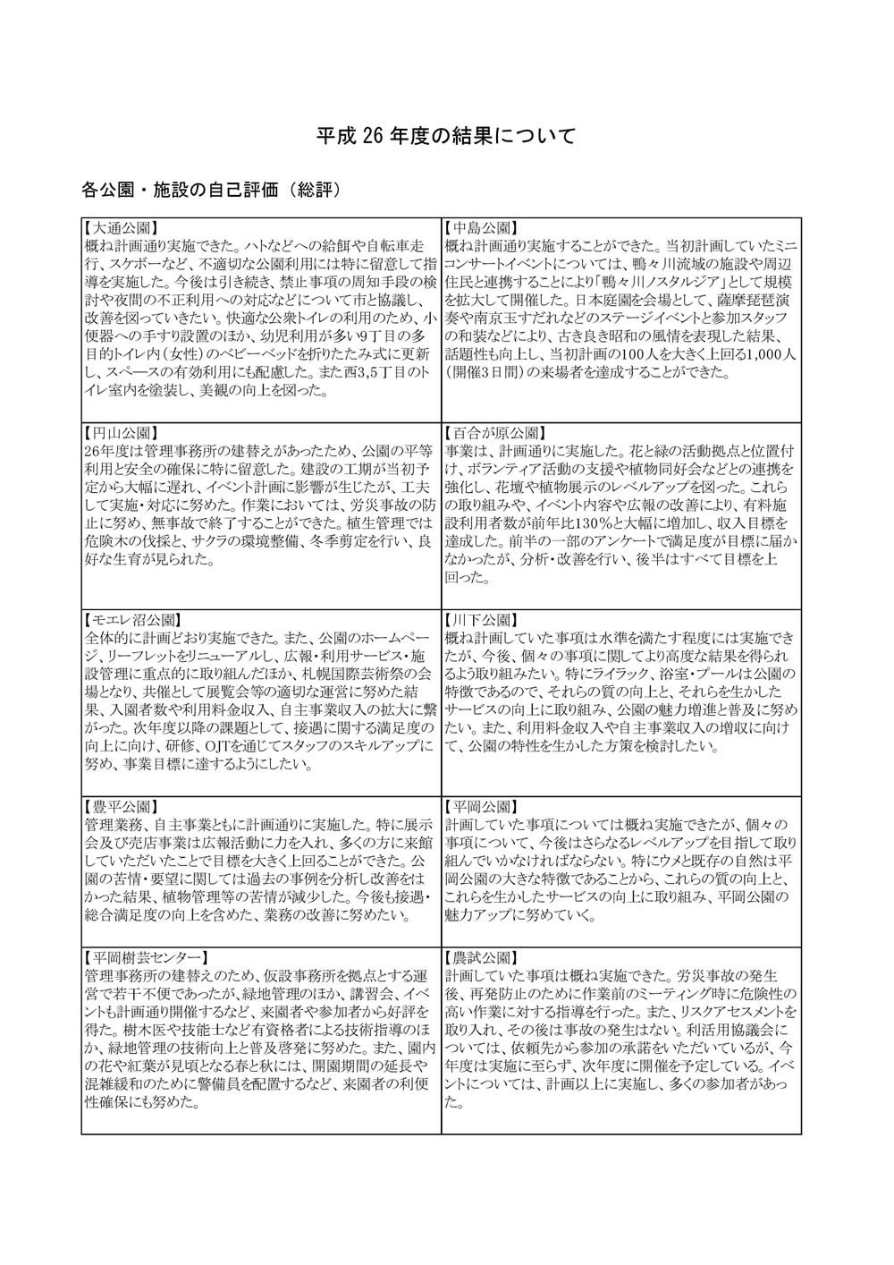 公園マネジメント評価の結果(平成26年度) 2015年12月28日 当協会の各公園・施設では、計画書に則して管理や提案が適切に実施されてい るかを確認・検証し、継続的改善につなげるため、「公園マネジメント評価シス テム」を構築・運用しています。 この評価システムの概要と平成26年度の結果(総評)について、下記資料で公 開しています。 ・H26公園マネジメント評価(PDFファイル 231KB)