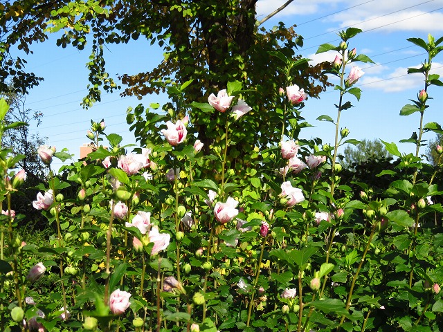 少年野球場沿いの園路ではムクゲの花が開花中です。併せてご覧いただきたいポイントです!