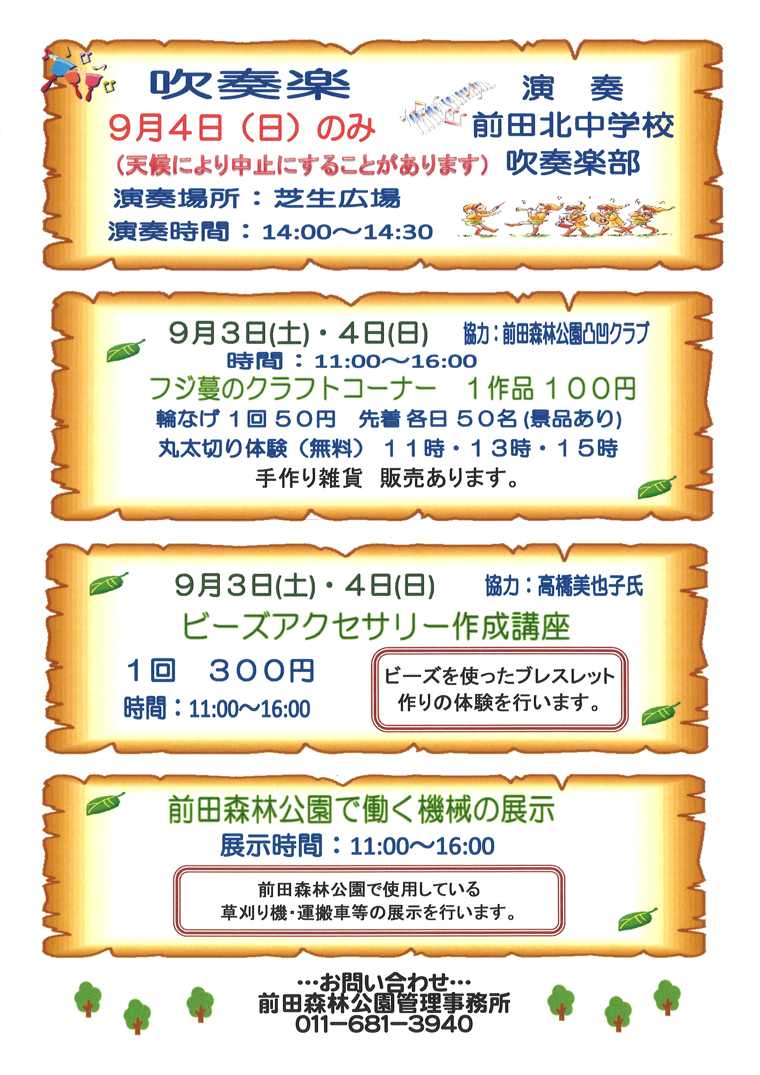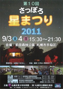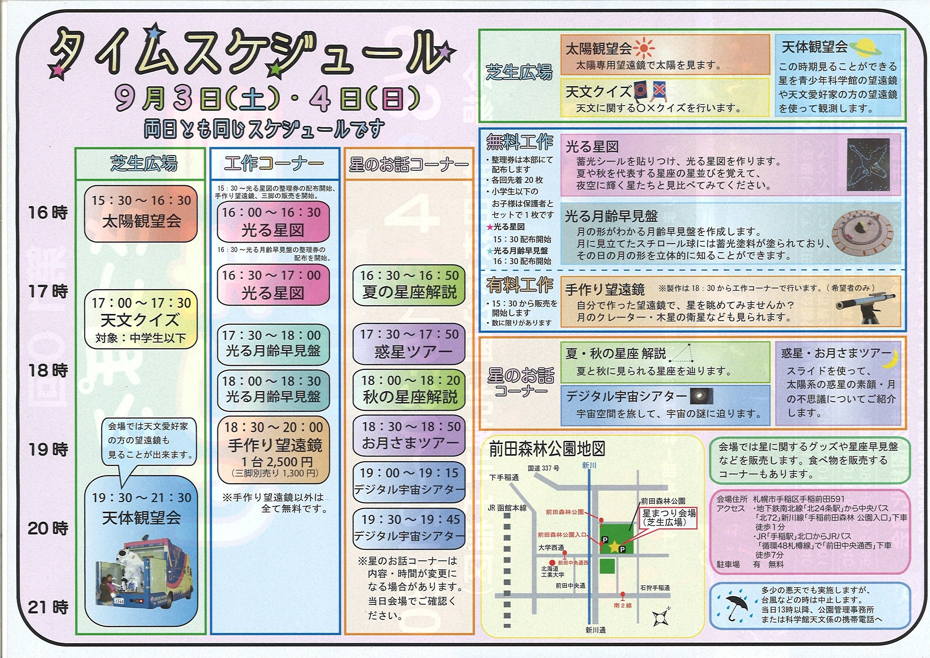 ☆☆☆ 前田森林公園からのお知らせ ☆☆☆ 第5回前田森林公園まつり&さっぽろ星まつり2011を 9月3日(土)・4日(日)に開催いたします。 前田森林公園まつり 詳細は ↓ さっぽろ星まつり 詳細は ↓