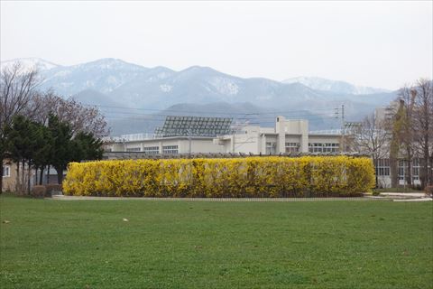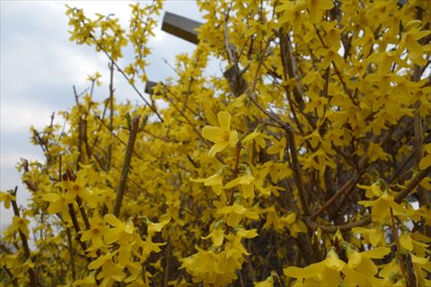 手稲の星置公園で、レンギョウが満開です。場所は学校側、丸い広場のシェルターのところです。