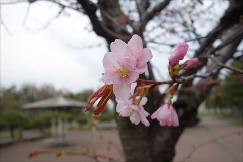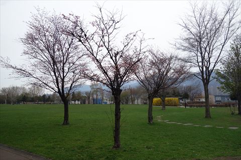 桜の場所は、手稲自動車学校と広場の間、あずまやのそばです。奥にレンギョウの黄色が見えます。満開はまだこれからのようですね。