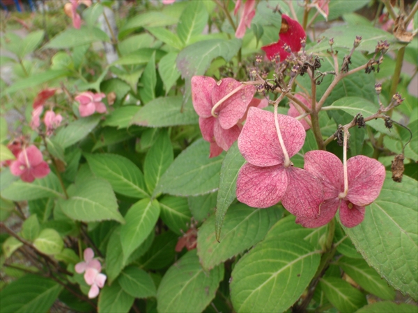 先月は白かったガクアジサイの装飾花が、ピンク色に染まっていました。
