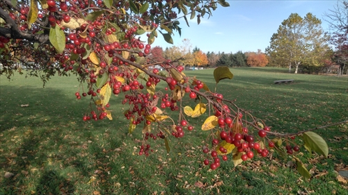 エゾノコリンゴの実が真っ赤に熟し。