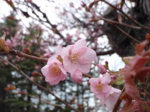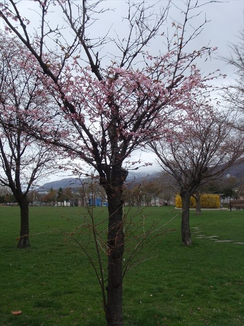 自動車学校側にある3本のサクラは、背の低い1本が一番咲き進んでいました。後ろの2本の開花はこれからです。