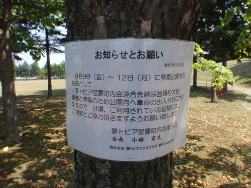 本日8月9日より、星置町内会連合会納涼盆踊り大会の準備のため公園内へ車両の出入りがございます。公園をご利用のみなさまにはご不便をおかけいたしますが、ご理解いただきますようお願い申し上げます。
