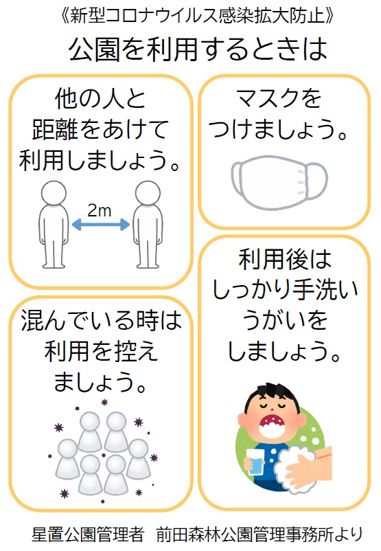 新型コロナウィルス感染症拡大防止のため、公園をご利用される際には、以下の対策についてご協力をお願いします。