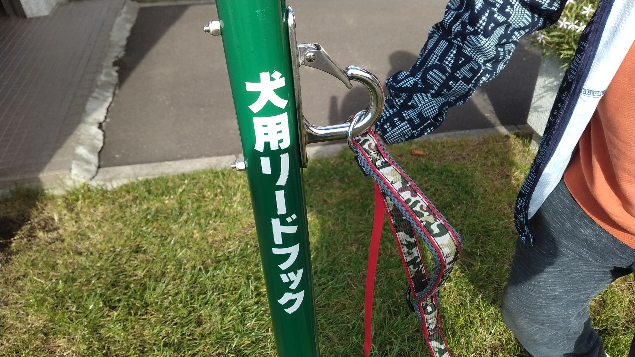 フックにこうして、リードを掛けていただくだけ。
