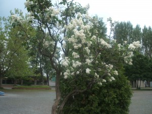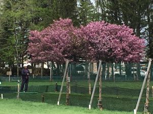 ベニユタカが終わりかけのころに、野球場そばの八重咲のサクラ「カンザン(関山)」が咲き始めます。