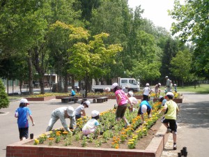 本日、稲積小学校の生徒さんが休養広場の花壇に花苗を植えてくれました(^-^)