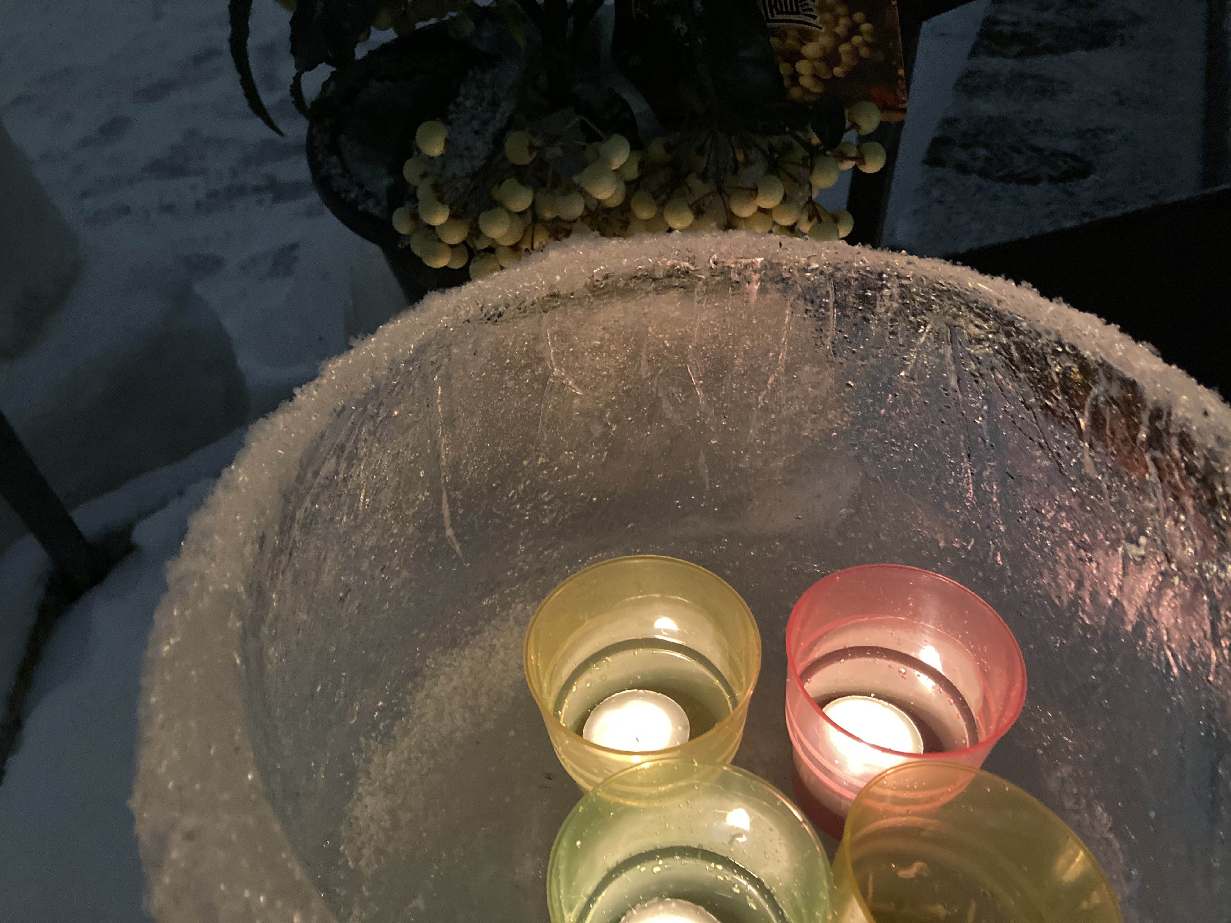 午後には少し落ち着いていた風も「よーし!点灯始めるぞ!」と意気込んだ途端に風が吹きはじめ、しまいには雪まで降ってきてしまいました・・・が、時より風が落ち着いたときは綺麗にろうそくが灯っていました。