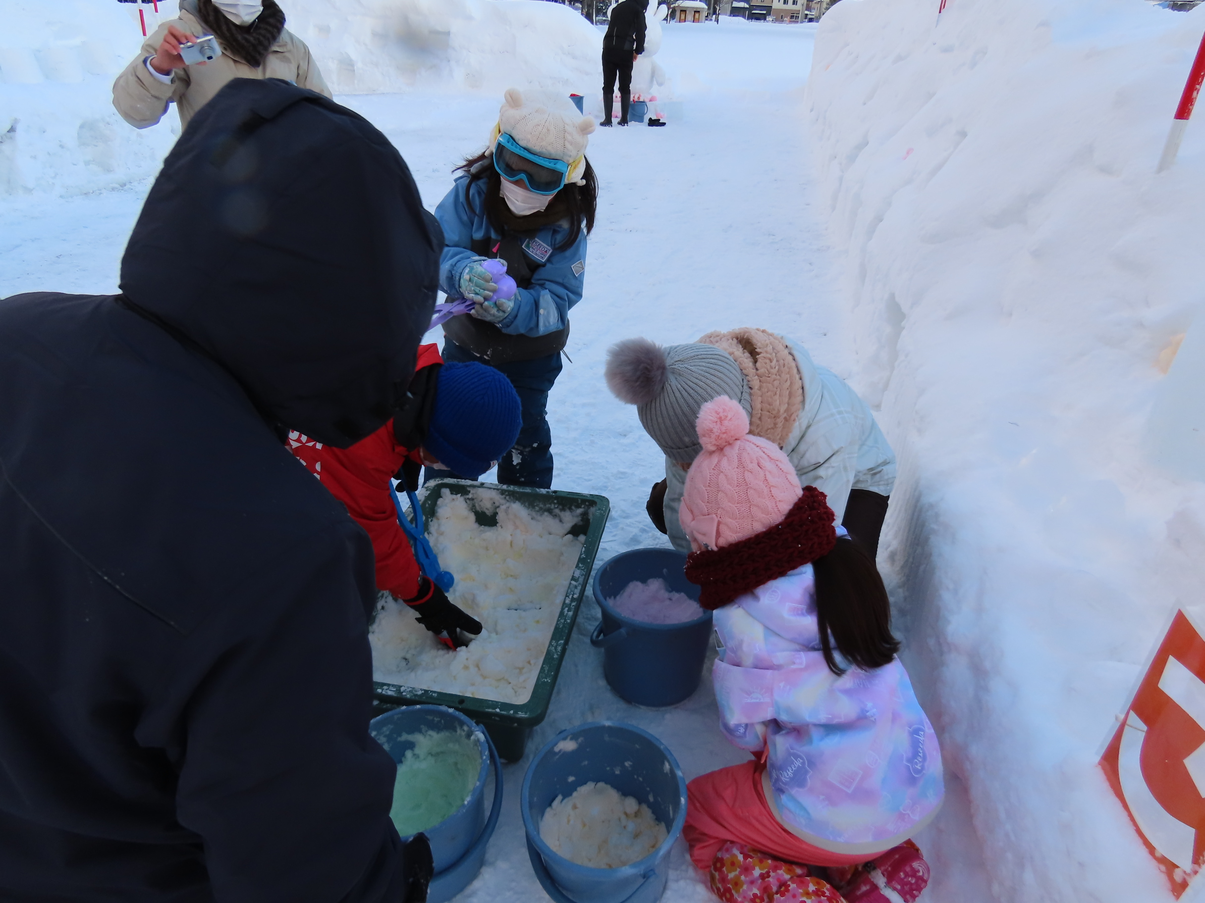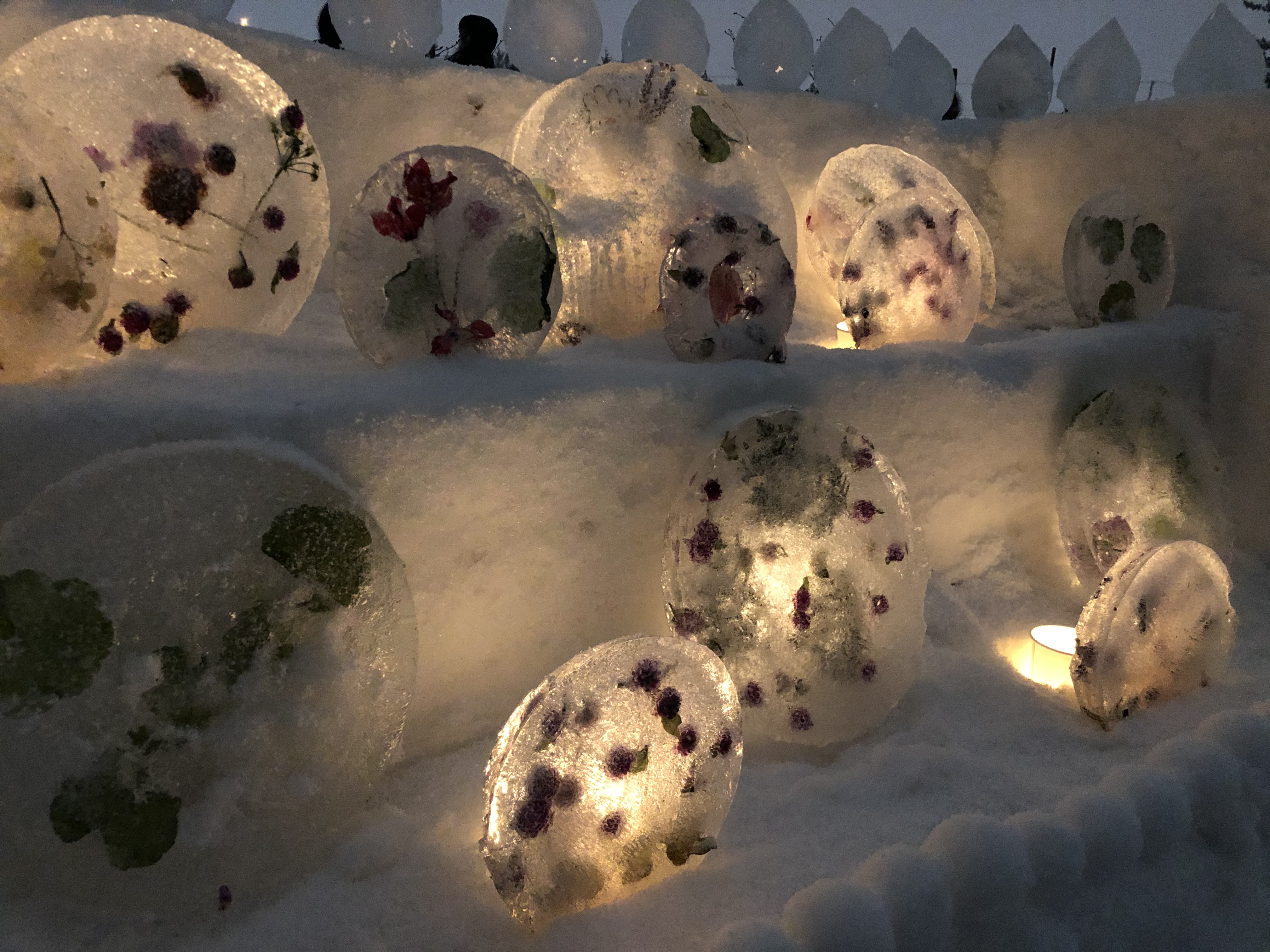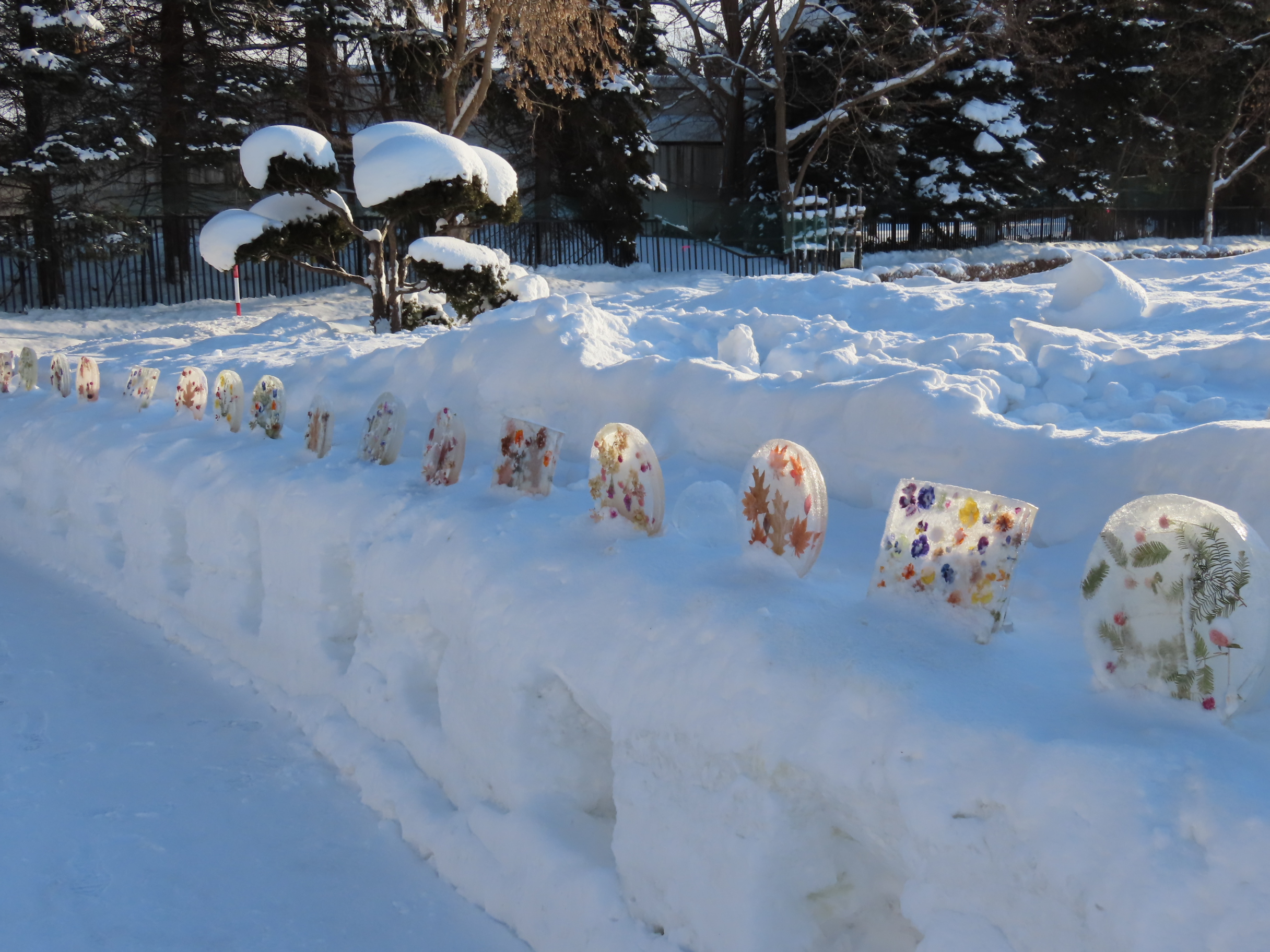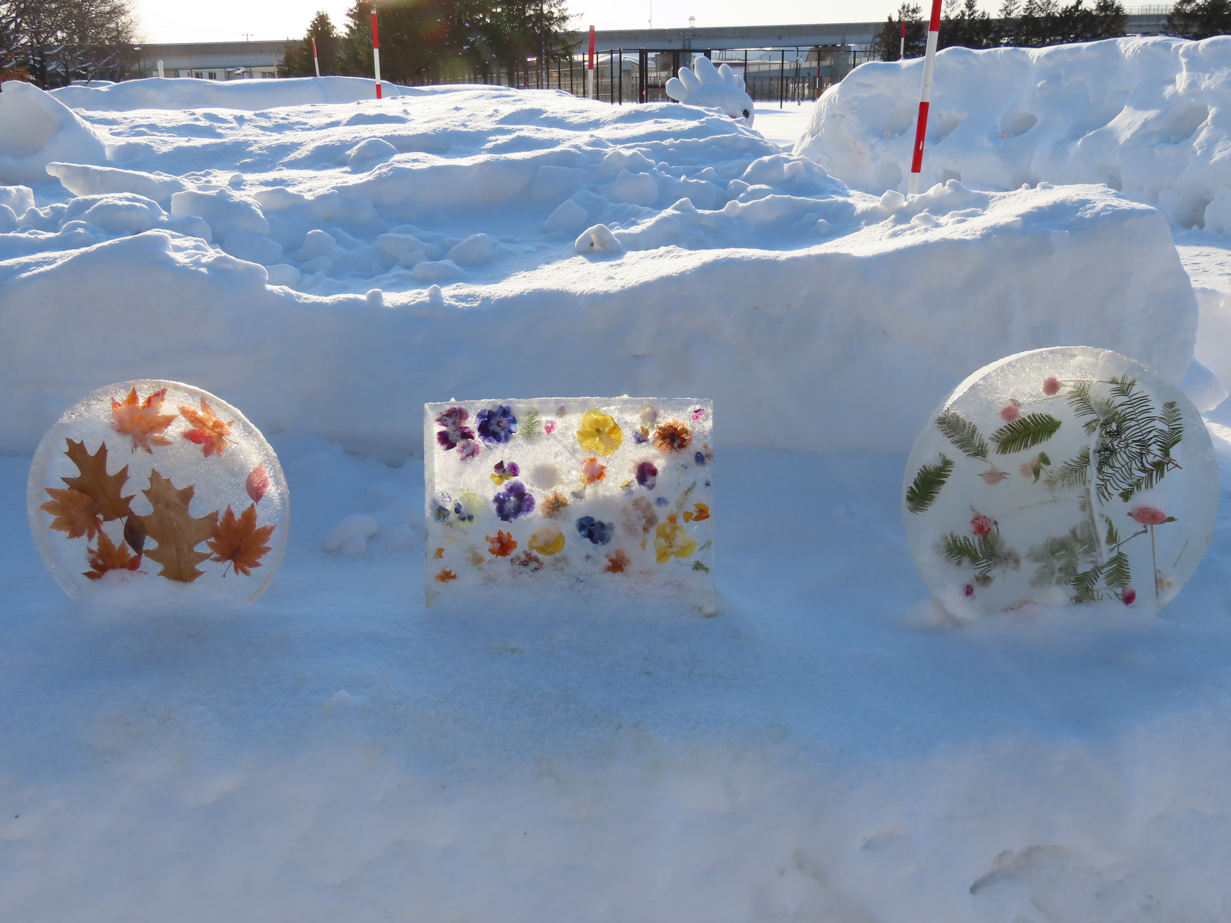 今年は丑年なので丑の雪像が登場しました。子どもたちには大人気で撮影スポットになっていました。毎年恒例のアイスボードは手稲稲積公園で夏に咲いていたお花をドライフラワーにして使っています。
