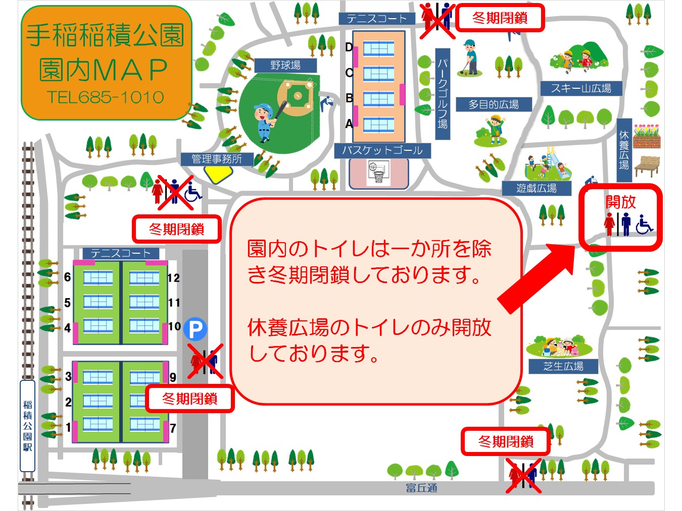 公園ニュース 屋外公衆トイレ冬期閉鎖のお知らせ 2021年10月29日 凍結の恐れがあるため、園内の屋外公衆トイレを11月8日月曜日より順次閉鎖させていただきます。 また、12月1日よりは下記の図の通り遊戯広場横公衆トイレの1箇所のみの開放となります。 ご不便をおかけいたしますが、予めご了承くださいますようお願い申し上げます。