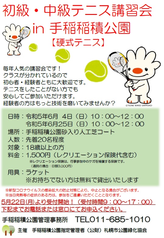 6月に、初級・中級テニス講習会in手稲稲積公園を開催します。