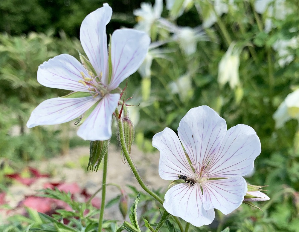 草丈30cmほどの宿根植物です。インド北部のカシミールに分布するフウロソウの仲間です。灰白色の花びらに淡い赤紫色の脈が浮かびます。多くのユリの植え床の地温を安定させる下草に適した葉群を地下茎によって広げます。