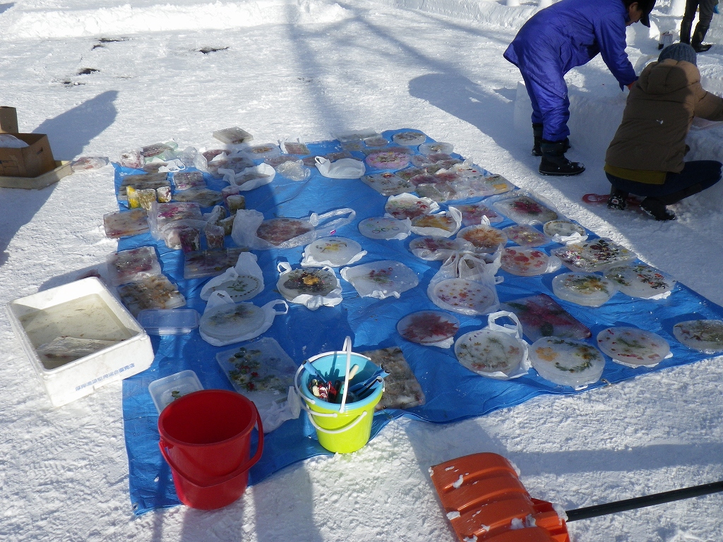 スノーキャンドルの他、環境サポーターズ三次郎の会の皆様が持ち寄ってくださったアイスボードやアイスキャンドルも飾り付けました。